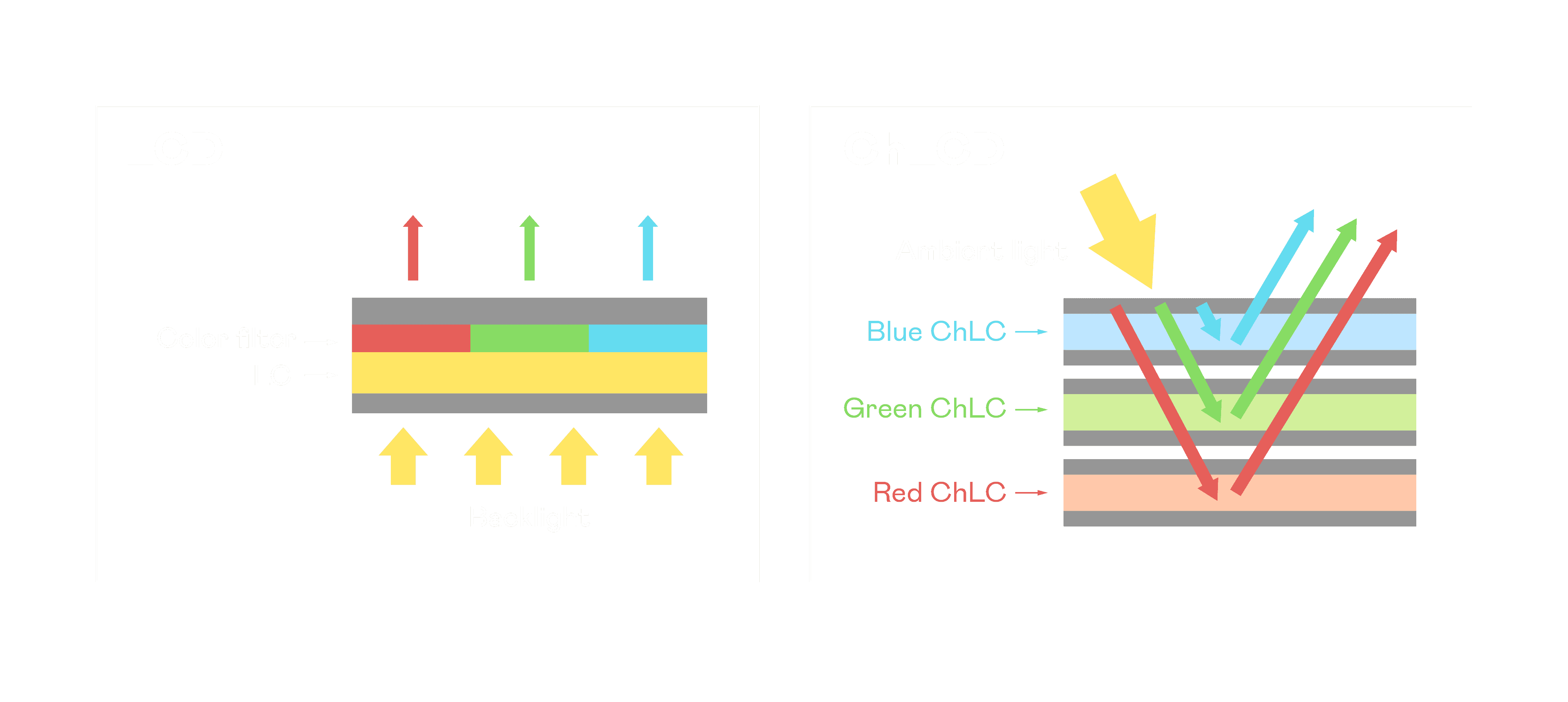 ChLCD 胆固醇液晶就如同纸张一样,,,透过反射环境光来显示影像,,因此长时间观看不易造成人眼视觉疲劳,,,可达到护眼效果。。。当处于户外阳光下使用,,,,LCD 影像容易失真而不易观看,,但胆固醇液晶仍可维持较佳的影像品质。。。