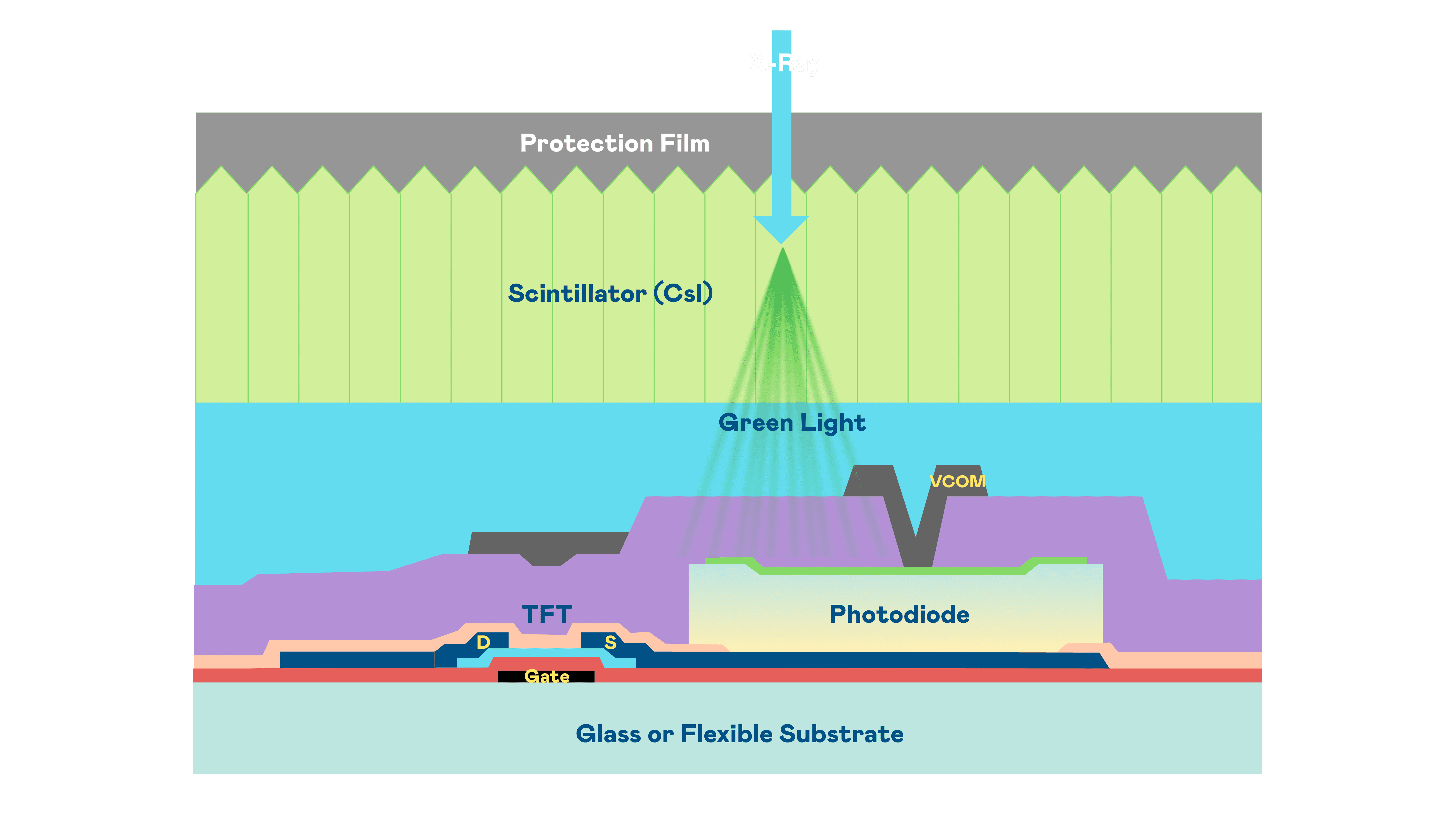 赏金国际的X光影像感测阵列使用薄膜电晶体 (TFT) 作为每个像素的读取开关,,,,搭配光电二极体(Photodiode)的光电转换元件,,用以感测X光影像讯号。。。。